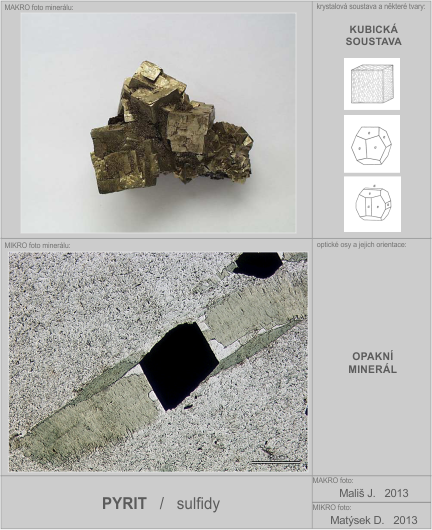 Fyzikální a chemické vlastnosti minerálu. Pyrit krystalizuje v kubické soustavě, vyskytuje se krystalický (rýhované krychle, osmistěny a dvanáctistěny pětiúhelníkové) někdy zdvojčatělý, agregáty bývají zrnité, celistvé a někdy paprsčitě stébelnaté. Markazit krystalizuje v rombické soustavě, krystaly bývají ostře pyramidální a srostlé, agregáty kusové, zrnité a stébelnaté. Pyrit + markazit mají mosazně žlutou barvu s šedavým odstínem až zlatožlutou, hnědou se silným kovovým leskem. Vryp mají černý s odstínem do hněda, tvrdost T = 6-6,5, hustota h = 4,9 - 5,0 g/cm3.