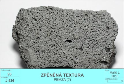 zpěněná textura - dutiny a póry převládají nad ostatní hmotou horniny (např. u vulkanického skla -pemzy)