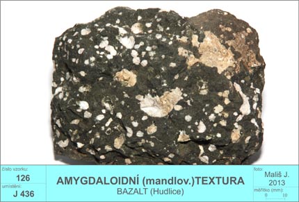 amygdaloidní (mandlovcovitá)textura - vzniká z textury vezikulární vyplněním dutin (vezikul) minerály vysráženými z roztoků, vznikají mandle tvořené kalcitem, chloritem, křemenem a achátem (typické pro horninu bazalt-melafýr)