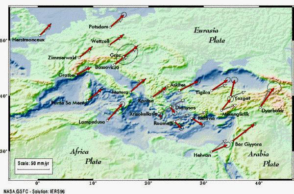 Obr. 3.10 Vektory pohybu (červené šipky) litosférických desek na styku euroasijské a africké desky zjištěné na základě laserové satelitní geodezie pro pevné měřicí stanice. (http://www.ngdc.noaa.gov)