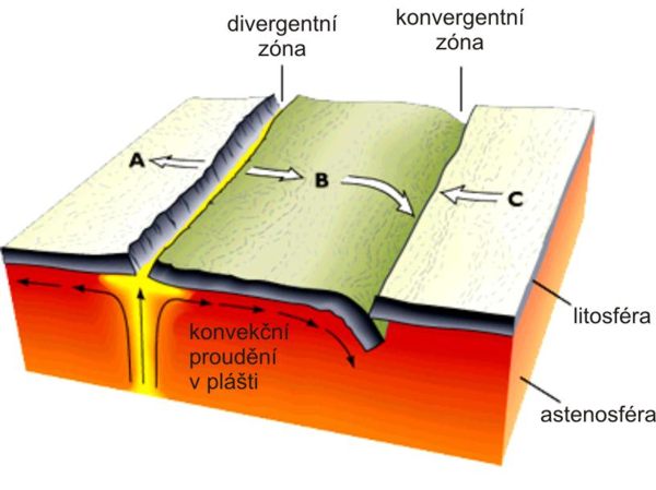 Jak ukázaly především geofyzikální výzkumy probíhající od počátku 60. let 20. století, není litosféra homogenní a izotropní svrchní obálkou Země. Především výsledky seismiky, zvláště přesná 3-D lokalizace hypocenter zemětřesení indikuje rozdělení zemské litosféry do řady velmi rozdílných a velikostí značně diferencovaných litosférických desek (viz obr. 3.9). Již na počátku 60. let především např. paleomagnetický výzkum, spolu s absolutním datováním hornin oceánské kůry, přinášel důkazy o změně pozic – kontinentálním driftu litosférických desek v průběhu geologického vývoje. Současná satelitní geodézie posledních dvou desetiletí pak poskytuje stále nové, velmi přesné údaje o jejich aktuálním pohybu (obr. 3.10). Příčiny driftu jsou všeobecně odvozovány od tzv. konvekčních proudů v zemském plášti (obr. 3.11) a souvisí nepochybně s výstupem tepla ze zemského jádra a pláště k povrchu. V důsledku aktivity těchto proudů dochází nad místy jejich výstupu k divergentnímu pohybu (rozpínání – pohyb od sebe) sousedních litosférických desek. Divergentní desková rozhraní jsou lokalizována především v středooceánských riftových zónách (obr. 3.9), ale také v oblastech kontinentálních riftových zón (např. východoafrický riftový systém).