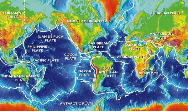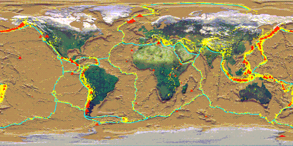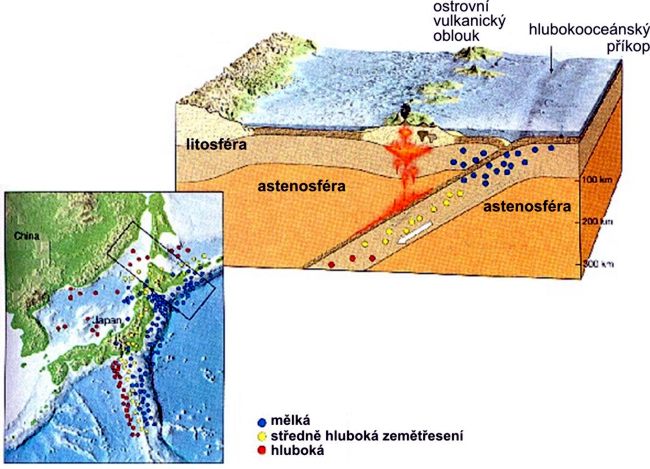 Lokální koncentrací napětí v zemské kůře a plášti v důsledku tektonických pohybů jednotlivých desek dochází ke vzniku tektonických zemětřesení – přirozené seismicity (obr. š.12 a 3.13). Ohniska zemětřesení jsou lokalizována především v tektonicky aktivních oblastech - zónách divergence a především zónách konvergence. Aktivní desková rozhraní jsou současně centry magmatismu, především pak efuzivní vulkanické aktivity. Nad zónami subdukce, v důsledku tavení korových hornin podsouvaných litosférických desek, se vyvíjí tzv. vulkanické ostrovní oblouky. Současně dochází v zónách divergence - v riftových pásmech středooceánských hřbetů, k podmořskému čedičovému vulkanismu, který zaplňuje otevřený prostor – „trhliny“ po vzdalujících se (divergujících) litosférických deskách.