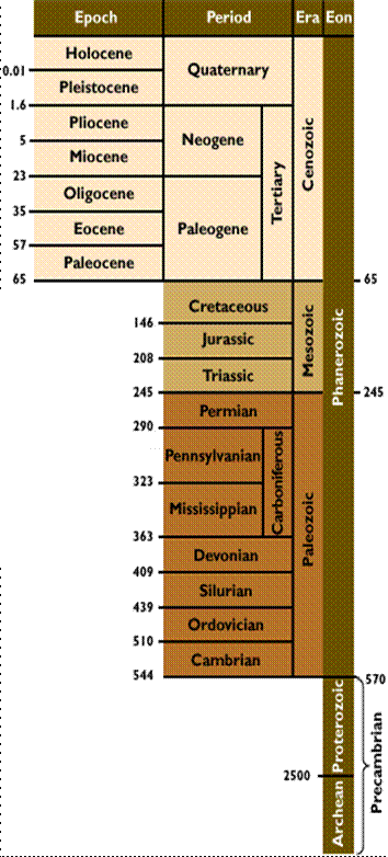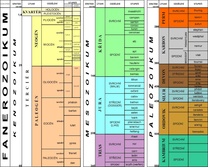 V běžné geologické praxi však často vystačíme s určením relativního stáří . Znamená to určit, zda je daná konkrétní hornina mladší, nebo starší než jiná. Totéž platí i o stáří zlomů, vrásových deformací, geologických těles a formací, georeliéfů včetně fosilních atd. Zde je rozhodující paleontologická metoda využívající nálezů zkamenělin v sedimentárních horninách. Paleontologie spolu s některými sedimentologickými metodami nám dává možnost sestavit chronostratigrafickou tabulku (viz obr. 3.1ř a 3.16).