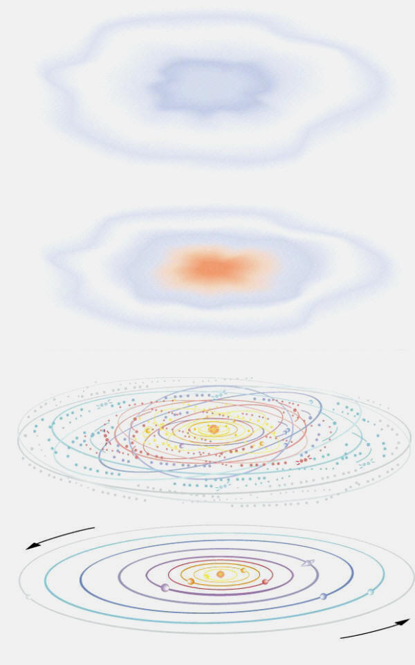 Již v roce 1755 předložil německý filozof Kant představu, že počátek našeho solárního systému je v rotujícím mračnu meziplanetárního prachu a plynů. Avšak teprve v posledních dekádách se astronomové znovu vrátili k této představě a propracovali ji do podoby hypotézy hvězdné mlhoviny (nebular hypothesis). Z této primární mlhoviny - supernovy působením gravitačních sil mezi jednotlivými částicemi docházelo postupně k utváření stále větších rotujících shluků hmoty (viz obr. 3.1). To vedlo ke vzniku Slunce a jednotlivých planet, tak, jak jsou nám v rámci naší sluneční soustavy známy dnes (obr. 3.1).