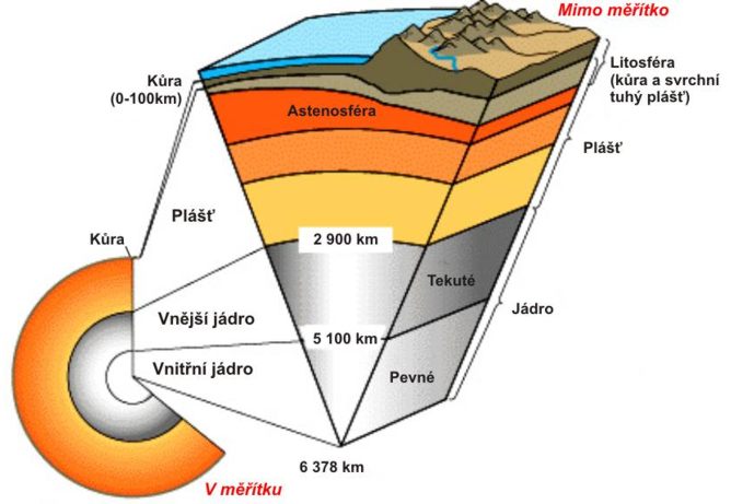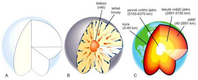 Postupnou gravitační diferenciací vnitřní hmoty Země, doprovázenou migrací lehkých hmot do vnějších a těžkých do vnitřních sfér, se konstituovala základní sférická zonálnost naší planety. Od povrchu do nitra Země můžeme vymezit postupně zemskou kůru, plášť a jádro (obr. 3.3 a 3.5). Železo, které od počátku vzniku Země reprezentovalo přibližně třetinu jejího objemu, spolu s některými dalšími kovovými prvky, především niklem, migrovalo v důsledku gravitační diferenciace do jejího nitra (viz obr. 3.3). Tento proces podmínil vytvoření zemského jádra. Díky vývoji (nárůstu) vnitřní teploty a tlaků Země je vnější jádro ve stavu taveniny (tekuté) a vnější jádro je pevné.