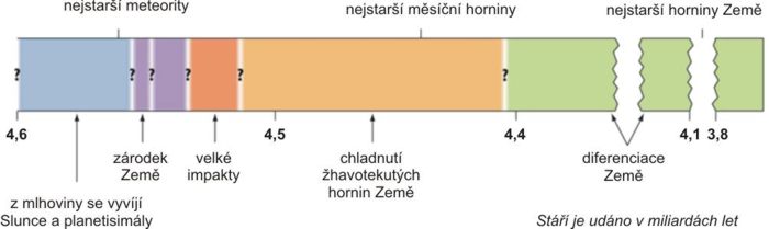 Obr. 3.4 Časová osa ukazující hlavní události raného stadia vývoje Země v rámci naší sluneční galaxie. Porovnej s obr. 3.17. Upraveno podle Presse & Severa 1998. |
