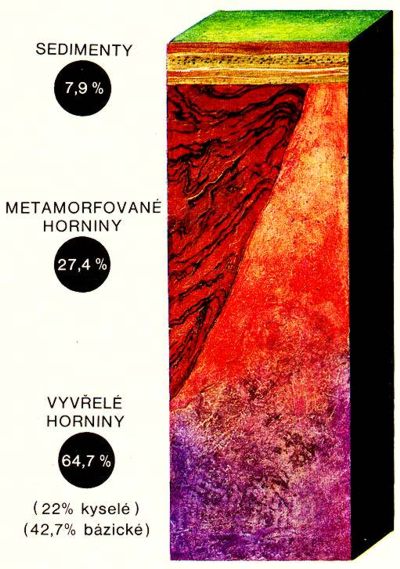 Obr. 3.8 Vzájemné poměrné zastoupení jednotlivých typů hornin v zemské kůře (Jakeš, 1984). |