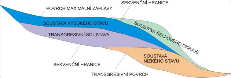 Sekvence bývají členěné do tzv. systémových soustav (obr. 2, 3). Mezi hlavní patří: soustava nízkého stavu hladiny (lowstand system tract, LST), transgresívní soustava (transgressive system tract, TST), soustava vysokého stavu hladiny (highstand system tract, HST) a soustava sedimentů klesajícího stavu (falling systém tract, FST). Maximální dosah hladiny během transgrese se označuje jako povrch maximální záplavy (maximum flooding surface, mfs).