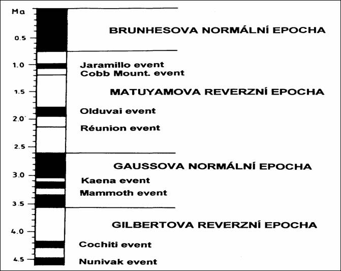 Obr. 1. Paleomagnetická škála pliocénu a pleistocénu. Členění na magnetické epochy a události (eventy). černá – normální orientace magnetického pole; bílá – reverzní orientace (Ogg, 1995).